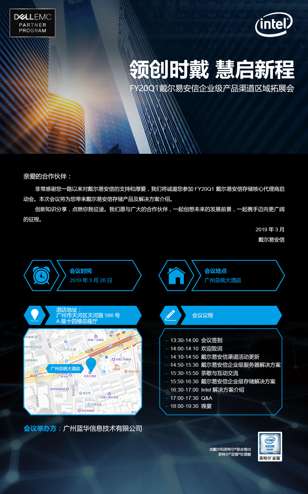 广州蓝华信息科技有限公司将于3月20日在广州总统大酒店举行“领创时戴,慧启新程”FY20Q1戴尔易安信企业级产品渠道区域拓展会。本次会议是广大合作伙伴进行技术交流的良好平台。会议期间...